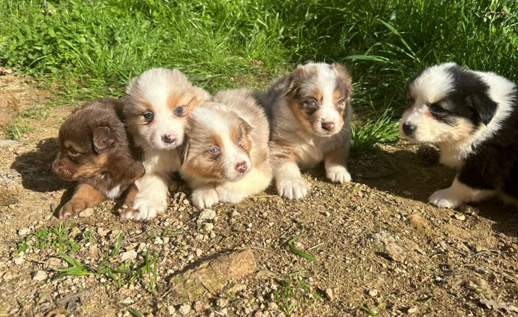 Les chiots sont nés le 12 juin. Ils seront disponibles à l’âge de 8 semaines, pucés et vaccinés avec leur certificat de bonne santé. Les couleurs disponibles sont le bleu merle et le noir tricolore.
